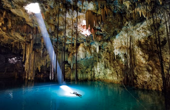 6. Hồ trong hang động Yucatan phía bắc Mexico, thiên đường của những người thích phiêu lưu. Hồ có địa hình mái bằng bên trên được hình thành cách đây khoảng 2 triệu năm trước. Hồ nước xa xôi này, ẩn mình kín đáo đem đến cho du khách những phút giây thực sự thoải mái.