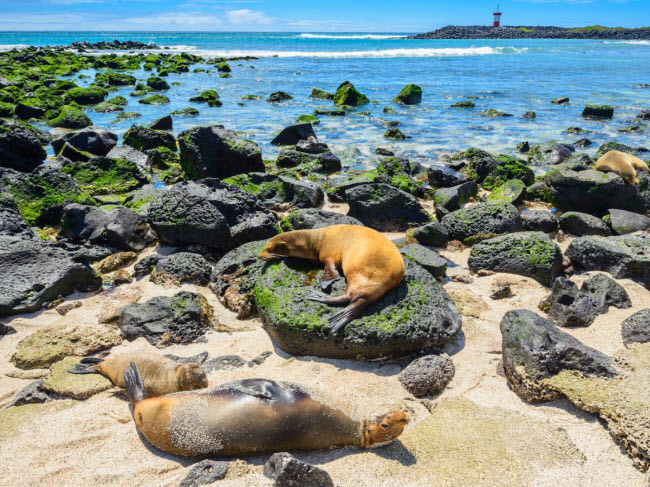 4. Galápagos, Ecuador: Những con sư tử biển nằm phơi nắng trên bãi biển Punta Carola là một trong những điểm đặc trưng của quần đảo Galápagos.