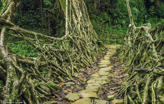 Cây cầu rễ cây Cherrapunji ở Meghalaya, Ấn Độ, được những người Khasi và Jaintia xây dựng thủ công bằng rễ của cây cao su nổi trên mặt đất.