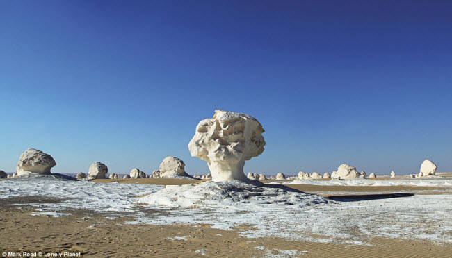 Sa mạc trắng ở Ai Cập là kết quả của quá trình xói mòn kéo dài hàng trăm năm, kết hợp với bão cát trắng để tạo ra những bức tượng khổng lồ có hình thù khác nhau.