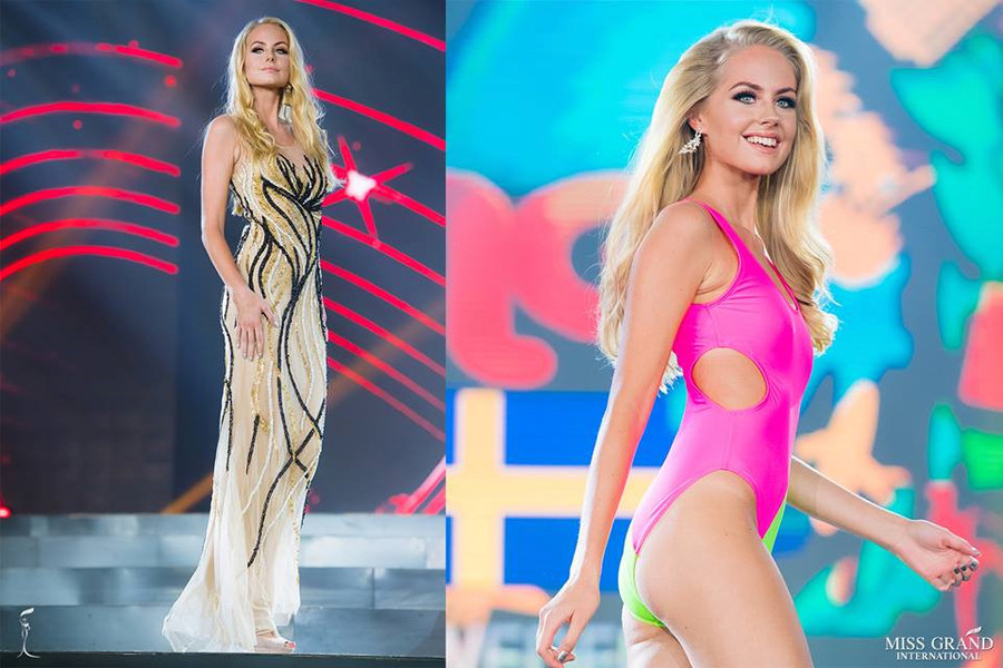 Khép lại danh sách là nhan sắc đến từ Thụy Điển - Hanna Louise Haag với góc chụp nghiêng đẹp rạng ngời trong đêm thi bán kết. Hanna 21 tuổi, cao 1,76 m, là người mẫu chuyên nghiệp. Cô từng tham gia Hoa hậu Thế giới 2017 và đạt thành tích top 40 chung cuộc.