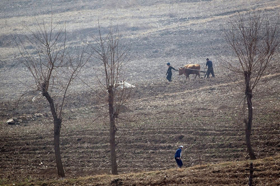 Nông dân Triều Tiên làm việc trên đồng gần Sinuiju, giáp biên giới với Trung Quốc tại thành phố Đan Đông vào tháng 4/2017. Ảnh: AFP