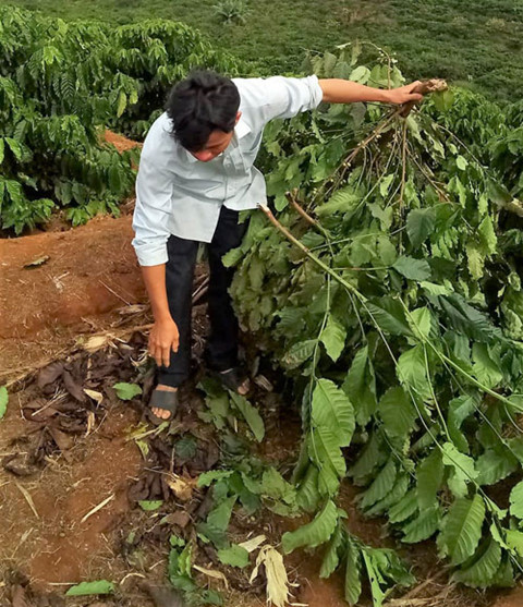 Anh Hải xót xa khi phát hiện vườn cà phê bị kẻ xấu chặt hạ. ẢNH: TRÙNG DƯƠNG