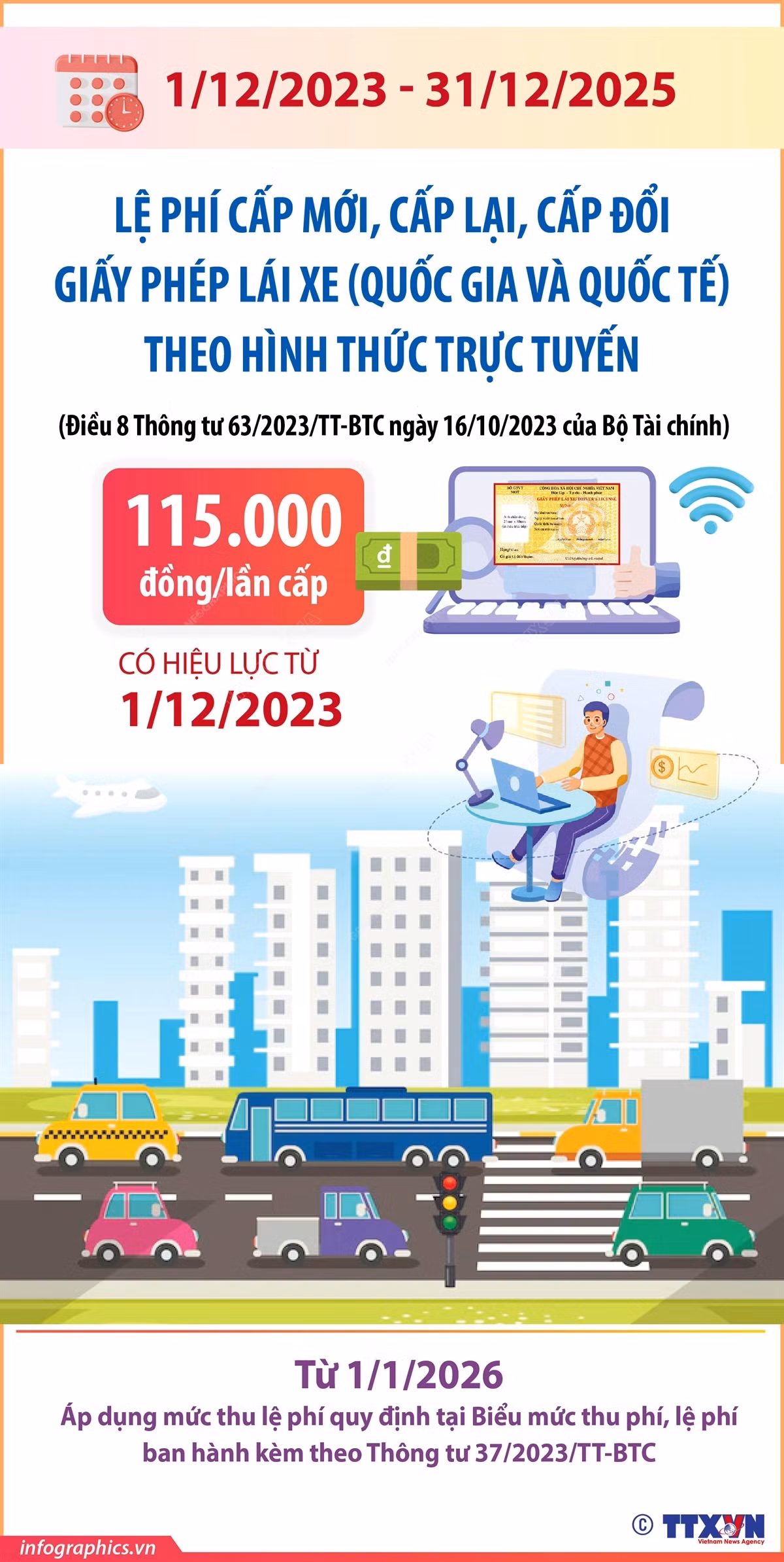Infographic 1/12/2023 - 31/12/2025: Lệ phí cấp mới, cấp lại, cấp đổi giấy phép lái xe online là 115.000 đồng