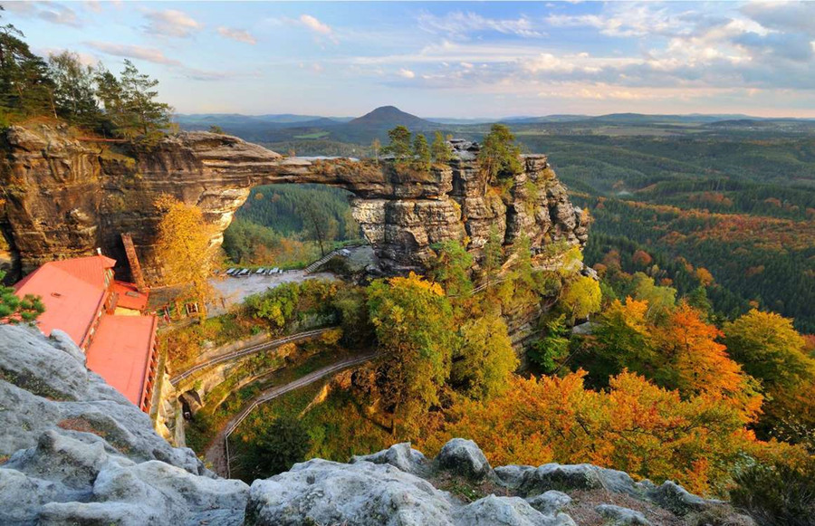 8. Công viên quốc gia Bohemian Thụy Sĩ - Công hòa Czech: Công viên nằm ở biên giới Thụy Sĩ - Cộng hòa Czech, cách Prague chỉ 2 giờ đi xe. Bên trong công viên là một hệ thống rừng thông đẹp quyến rũ cùng nhiều dòng suối trong vắt. Ấn tượng nhất ở đây là Pravčická Archwa, vòm đá sa thạch lớn nhất châu Âu, bên cạnh là lâu đài Falcon's Nest được xây dựng từ năm 1881.