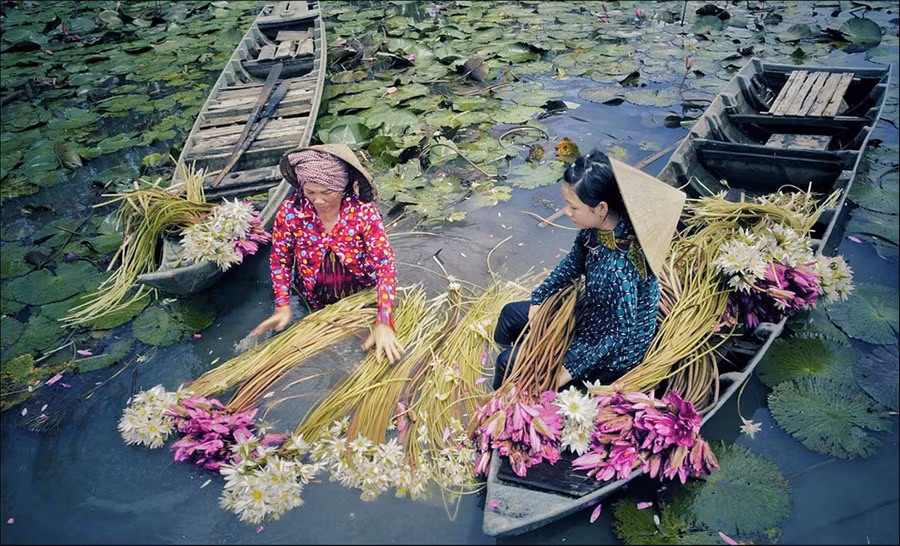 "Hồ Tây ngát hương mùa sen tháng 6". Hè về cũng là lúc loài hoa được coi là biểu tượng của Việt Nam tỏa hương khoe sắc. Chiếc xe hoa lăn đều bánh trên thảm lá vàng sau cơn mưa rào mùa hè trên phố Phan Đình Phùng (Hà Nội) tạo nên bức ảnh đẹp như tranh vẽ.