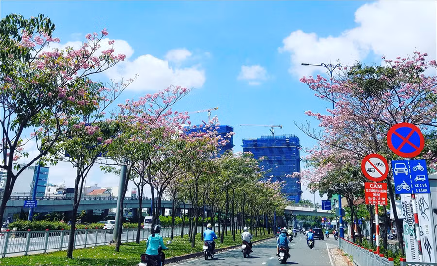 Mùa hè đến, hòa cùng ánh nắng chói chang là sắc tím bằng lăng trải dọc một khu phố tại TP.HCM.