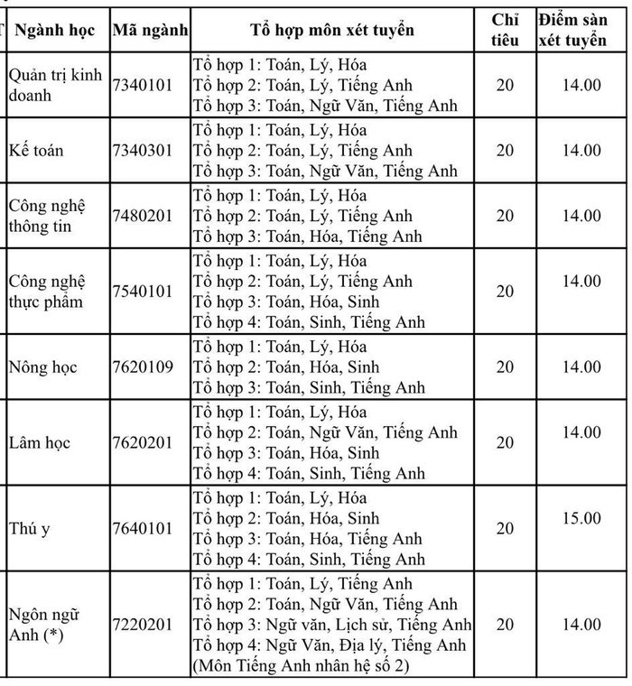Cụ thể, điểm nhận hồ sơ xét tuyển theo phương thức xét điểm thi THPT các ngành từ 14 trở lên (trừ ngành thú y nhận từ 15 điểm trở lên). Điểm này là tổng điểm 3 môn trong tổ hợp xét tuyển, chưa nhân hệ số và đã gồm điểm ưu tiên.