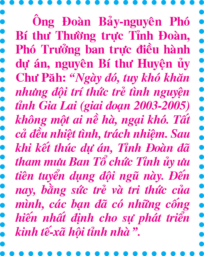Đúng như tinh thần của dự án, sau khi hoàn thành nhiệm vụ, các đội viên trí thức trẻ tình nguyện đều được ưu tiên tuyển dụng. Nhìn lại hành trình 20 năm, mỗi người đều có sự trưởng thành và cống hiến nhất định ở nơi mà mình đã gắn bó cả tuổi thanh xuân. Trong cuộc hội ngộ được tổ chức tới đây, đội lại vắng thêm 1 người, đó là chị Nguyễn Thị Yến-giáo viên tận tâm của Trường Tiểu học Kông Lơng Khơng (huyện Kbang). Cuối năm 2013, trên đường đi dạy, chị cùng 1 đồng nghiệp đã không may bị nước lũ cuốn trôi…