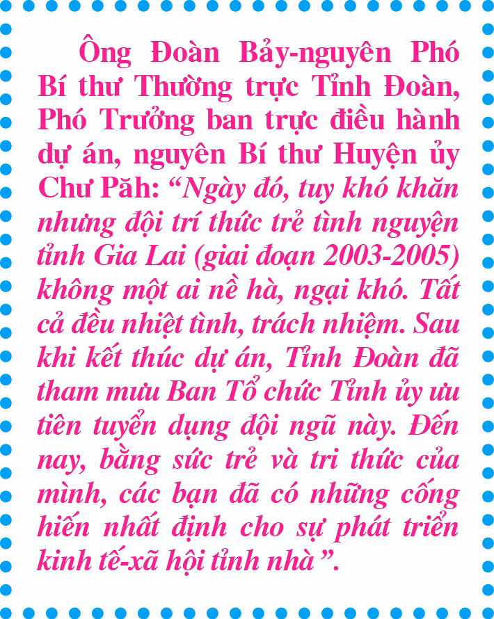 Còn anh Nguyễn Ngọc Thọ, ra đi từ xứ biển Bình Định cũng nhanh chóng trưởng thành và gắn bó với vùng đất cao nguyên khi lần lượt kinh qua nhiều “vai”, nay là Trưởng phòng Đoàn thể và Các hội quần chúng (Ban Dân vận Tỉnh ủy). Anh Thọ khẳng định: Khoảng thời gian tham gia dự án đã giúp bản thân hiểu thêm thực tế vùng khó, rèn luyện bản lĩnh. Niềm vui càng nhân lên khi đồng đội Nguyễn Thị Toan, cô gái quê Bắc Giang đã cùng anh hợp thành một gia đình nhỏ hạnh phúc. Hiện chị là giáo viên Trường Tiểu học Nguyễn Bá Ngọc (TP. Pleiku).