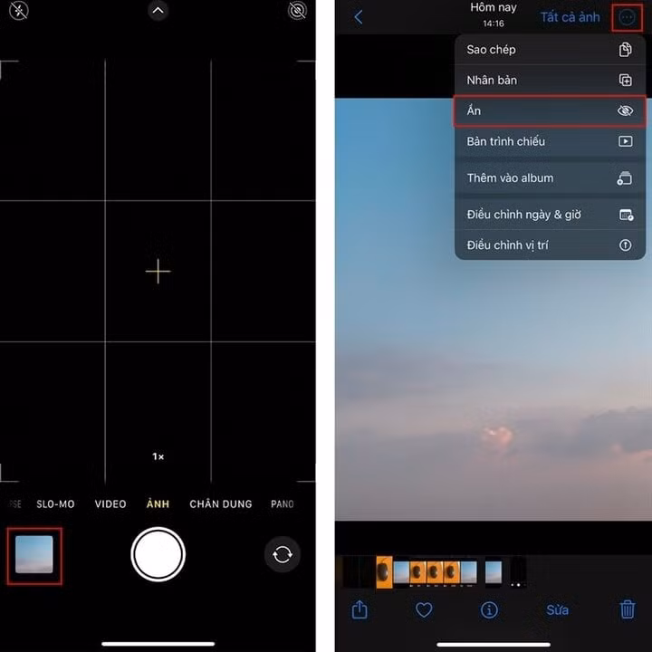 Các bạn thao tác như sau, ngay tại ứng dụng camera, sau khi các bạn đã chụp xong bức ảnh nhấn ngay vào ảnh bên phía dưới góc trái màn hình, chọn tiếp tục kích vào biểu tượng 3 chấm và chọn "Ẩn".