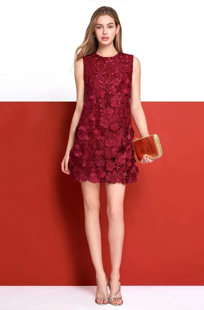 Trang phục mang tông đỏ nhiều sắc độ được khéo léo kết hợp với kỹ thuật xếp ly, chi tiết khóa kéo và khuy mạ vàng, phụ kiện và giày tông vàng/đen Họa tiết hoa 3D giúp mẫu váy liền dáng suông chữ A thêm phần thu hút, trong khi họa tiết hoa in bản lớn tạo nên vẻ thanh thoát cho bản phối màu đỏ bên phải