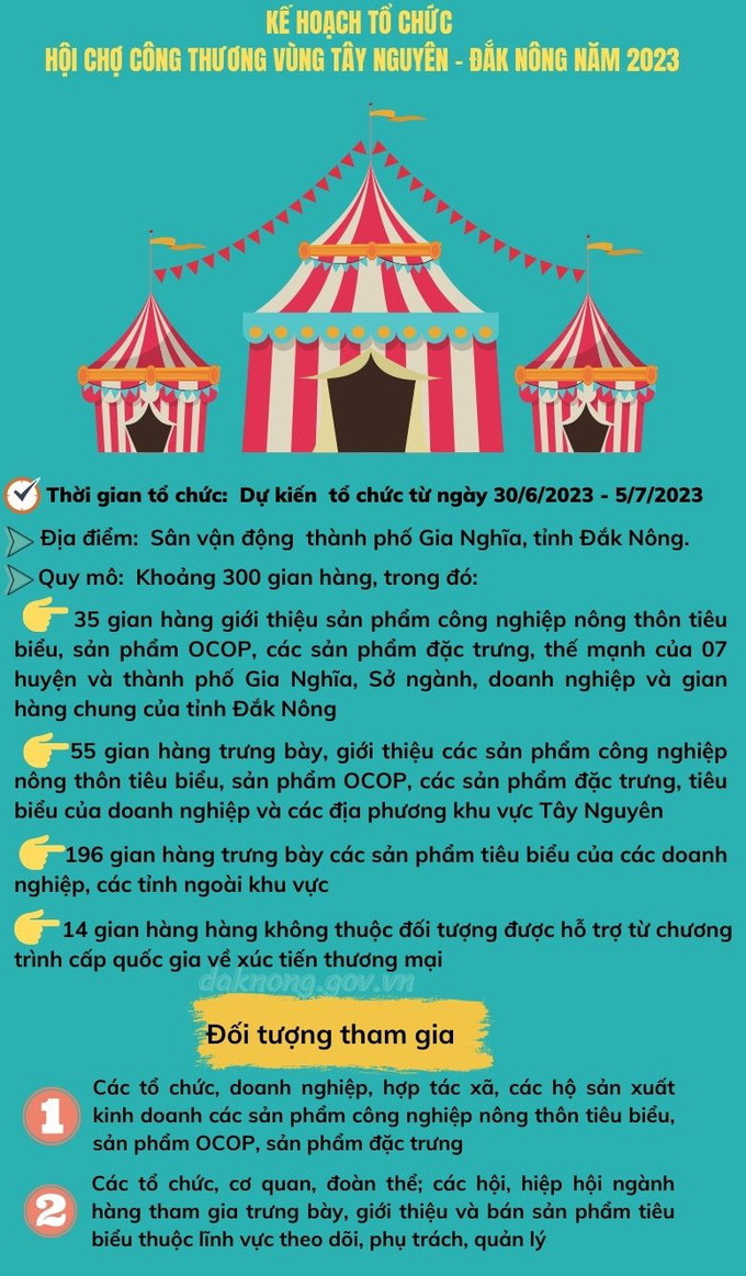 Để hội chợ diễn ra thành công, UBND tỉnh giao Sở Công Thương chủ trì, phối hợp với các sở, ban, ngành có liên quan và UBND các huyện, thành phố Gia Nghĩa tổ chức, triển khai thực hiện Hội chợ đảm bảo theo các quy định hiện hành và hiệu quả. Trong đó, các hoạt động của Hội chợ phải mang lại hiệu quả thiết thực cho các doanh nghiệp, doanh nhân tham gia; tạo hiệu ứng lan tỏa đến nhân dân trong và ngoài tỉnh; sản phẩm tham gia Hội chợ phải đảm bảo chất lượng, vừa phong phú, vừa đa dạng và độc đáo, tạo ấn tượng tốt cho các doanh nghiệp, doanh nhân, nhân dân và du khách tham gia, tham quan, mua sắm.