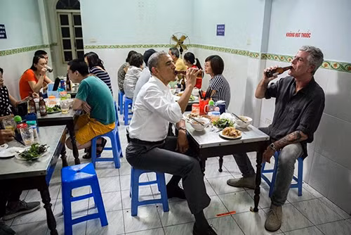 Trong thời gian ở Hà Nội vào tháng 5/2016, dù lịch trình dày đặc, cựu Tổng thống Mỹ Obama vẫn dành thời gian đi ăn với đầu bếp Anthony Bourdain. Họ dùng hai suất bún chả và hai chai bia trong quán ăn ở quận Hai Bà Trưng. Đây không chỉ là một bữa tối bình thường mà còn là buổi ghi hình cho Part Unknown - một show truyền hình về ẩm thực của đầu bếp danh tiếng người Mỹ. Ảnh: Facebook Anthony Bourdai.