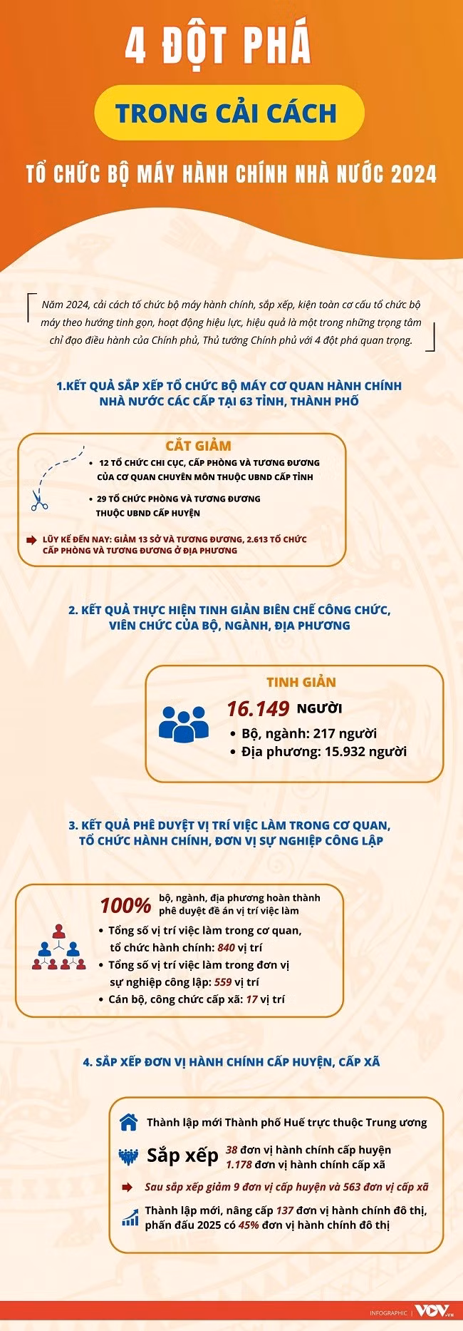Năm 2024, cải cách tố chức bộ máy hành chính, sắp xếp, kiện toàn cơ cấu tổ chức bộ máy theo hướng tinh gọn, hoạt động hiệu lực, hiệu quả là một trong những trọng tâm chỉ đạo điều hành của Chính phủ, Thủ tướng Chính phủ với 4 đột phá quan trọng.
