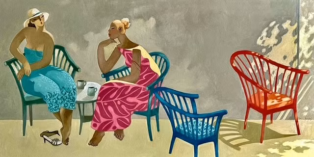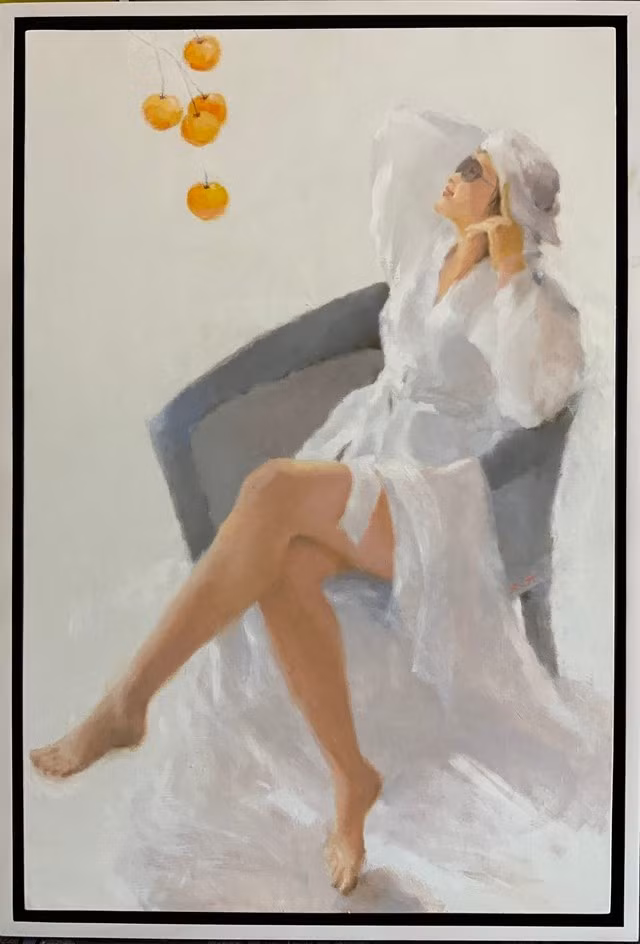 Anh Bach góp mặt cùng 3 bằng hữu tứ xứ bằng loạt tranh vẽ về phụ nữ. Trong đời thường, phụ nữ thường vất vả, lo toan nhiều bề. Vì vậy, ở trong tranh, Anh Bach muốn họ hiện diện trong khoảnh khắc đẹp đẽ, yên bình, viên mãn. Đó có thể là khoảnh khắc ngồi đọc sách, trang điểm, phơi nắng, hoặc lang thang chụp hình…