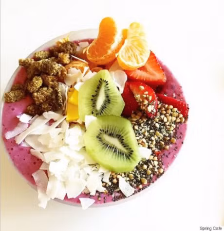 Thành phần chính của smoothie là hoa quả, hoa quả và hoa quả, thêm một chút ngũ cốc, bởi thế món ăn đẹp mắt này là nguồn chất xơ, vitamin C dồi dào. Khi bạn phải cắt hoàn toàn đường từ khẩu phần ăn thì một bát sinh tố hoa quả xay cùng những loại hoa quả tươi ngon miệng sẽ khiến bạn chẳng hề thấy cồn cào.