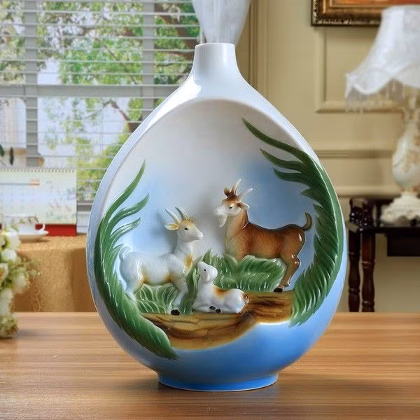 Những chiếc lọ thủ công bằng gốm sứ, bề mặt bóng đẹp với hoa văn kiểu dáng 3D sống động. Hình ảnh dê bố, dê mẹ và dê con sum vầy bên nhau hứa hẹn một năm mới tràn đầy hạnh phúc.