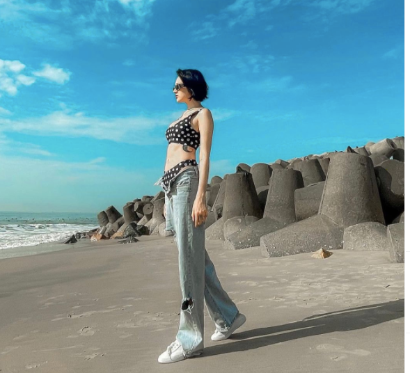Ngoài bộ trang phục trên, Lương Thùy Linh còn gây chú ý khi diện áo trễ vai kết hợp với quần jeans đi biển. "Đi biển thôi từng người ơi! Nào mình cùng vẫy tay nào", người đẹp chia sẻ.