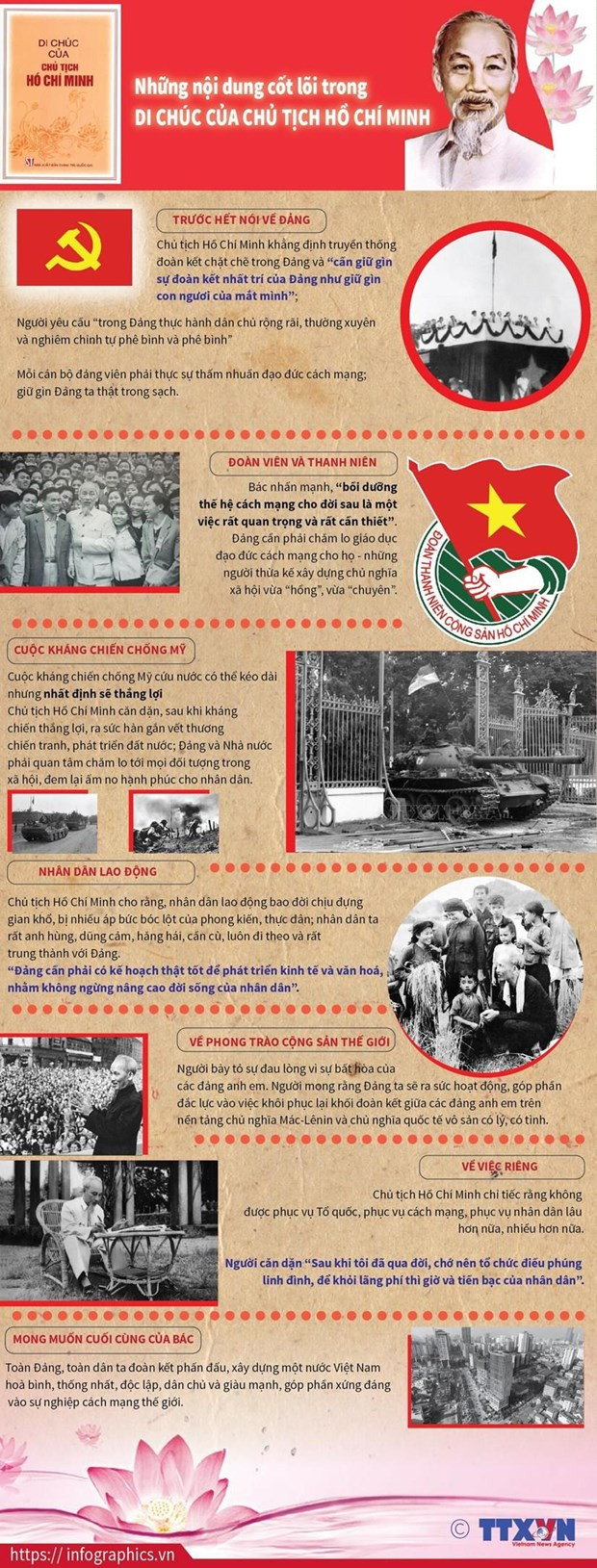 Di chúc của Chủ tịch Hồ Chí Minh là một văn kiện lịch sử vô giá tổng kết lý luận và thực tiễn cách mạng Việt Nam, phương hướng phát triển của dân tộc. Bên cạnh đó, bản Di chúc cũng thể hiện cô đọng tư tưởng, nhân cách, bản lĩnh của một vị Lãnh tụ, Anh hùng giải phóng dân tộc, Danh nhân văn hóa thế giới.