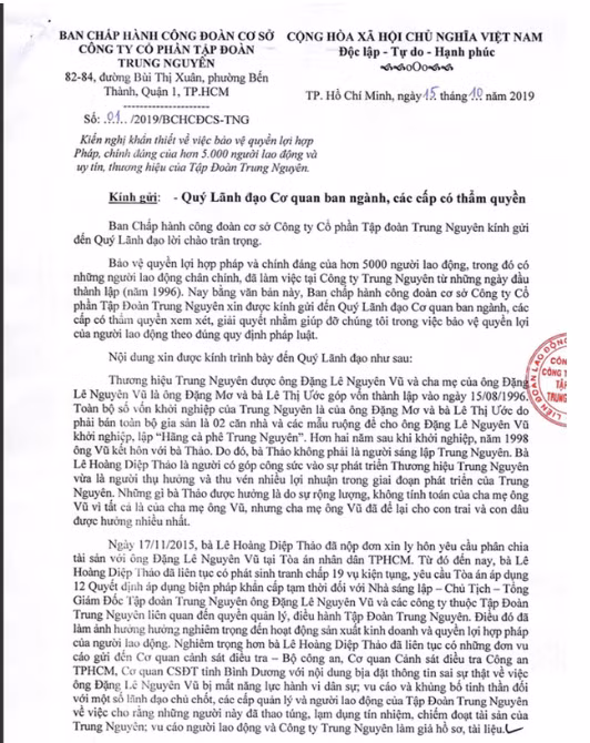 Theo đó, ông Trịnh Ty, Chủ tịch công đoàn Trung Nguyên đã tố cáo bà Lê Hoàng Diệp Thảo “bịa đặt, phá hoại bằng thủ đoạn thâm độc”, làm tê liệt toàn bộ hoạt động sản xuất kinh doanh cũng như kìm hãm sự phát triển của Tập đoàn. Từ đó, lá đơn kiến nghị cơ quan chức năng nhanh chóng can thiệp để bảo vệ quyền, lợi ích hợp pháp của 5.000 người lao động tại Trung Nguyên.