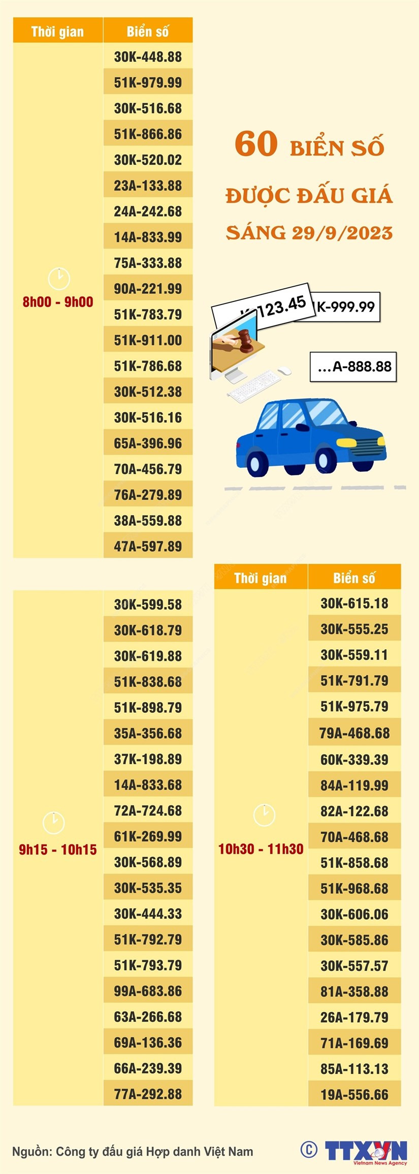 Công ty đấu giá Hợp danh Việt Nam đã công bố danh sách 60 biển số đẹp tiếp tục được đấu giá trực tuyến sáng ngày 29-9-2023.