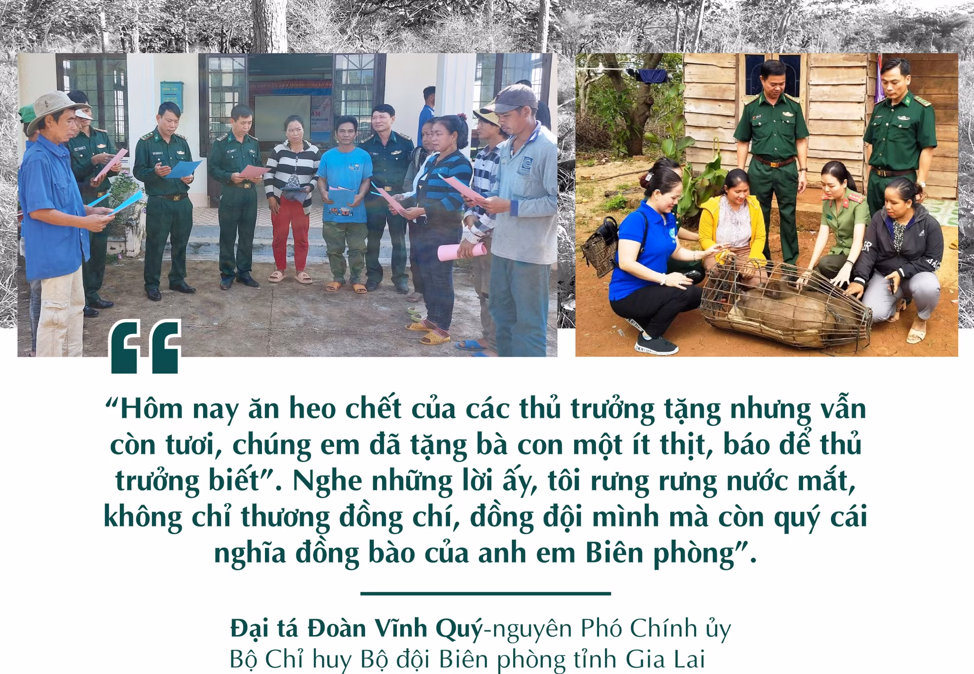 Năm 1989, ông Đoàn Vĩnh Quý rời quê hương Thanh Hóa vào Gia Lai công tác. Vị trí mà ông đảm nhận là Chủ nhiệm Chính trị BĐBP tỉnh. Dù đã trải qua nhiều khó khăn, gian khổ ở các tỉnh phía Bắc và Bắc Trung Bộ nhưng khi vào đến Gia Lai, ông cũng không khỏi bỡ ngỡ. Ông kể: Ngày ấy, trên địa bàn tỉnh chỉ có 4 đồn Biên phòng. Đường sá đi lại khó khăn, khu vực huấn luyện cho bộ đội chưa có, các đồn còn tạm bợ nhưng cán bộ, chiến sĩ vẫn luôn bám trụ để bảo vệ biên giới và giúp đỡ người dân. Có một câu chuyện không thể nào quên được đó là lần ông cùng đoàn công tác lên huyện biên giới Chư Prông để dự và chỉ đạo Đại hội Chi bộ Đồn Biên phòng Ia Mơr vào tháng 2-1992. “Khi đi, đoàn mang theo mấy con heo và lương thực để đơn vị liên hoan. Trên hành trình gian nan ấy, xe chúng tôi bị sa lầy. Ròng rã gần 1 ngày không thể đưa xe lên, mấy con heo chết dần. Thế là chúng tôi cử mấy người đi bộ vác heo và lương thực lên đồn trước. Hôm sau, khi đưa xe đến đơn vị thì cũng bắt đầu đại hội. Trong bữa cơm liên hoan, anh em đùa vui.