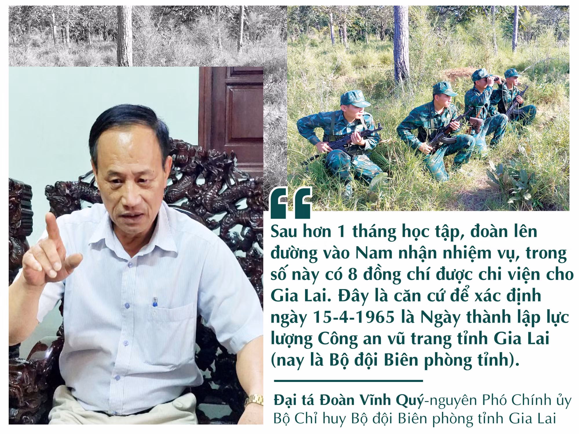 Với 40 năm công tác trong lực lượng BĐBP, Đại tá Đoàn Vĩnh Quý-nguyên Phó Chính ủy Bộ Chỉ huy BĐBP tỉnh hiểu khá rõ về truyền thống của đơn vị. Những ngày đầu tháng ba, trong căn nhà nhỏ ở số 26 đường Nguyễn Văn Cừ (TP. Pleiku), ông hồi nhớ: Để xây dựng và phát triển lực lượng An ninh vũ trang thuộc chiến trường B, ngày 1-3-1965, theo yêu cầu của Bộ Công an, Thường vụ Đảng ủy, Bộ Tư lệnh Công an nhân dân vũ trang triệu tập 252 cán bộ, chiến sĩ tổ chức huấn luyện để chi viện cho chiến trường B.