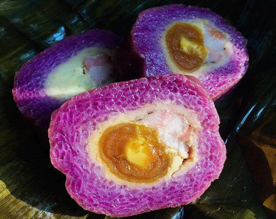 Người miền Trung ăn bánh tét kèm dưa món. Một số biến tấu đẹp mắt của hương vị truyền thống còn có bánh tét lá cẩm trứng muối, bánh tét ba màu, bánh tét ngọt… Bánh được gói thành những đòn trụ dài nên khi cắt từng khoanh nhìn đẹp mắt. Ảnh: Aizphong, anvatocsen.