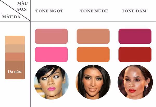 Với làn da sậm màu, sắc son phù hợp là những màu có tone nâu như hồng nhạt, cam nâu hay tím pha nâu.