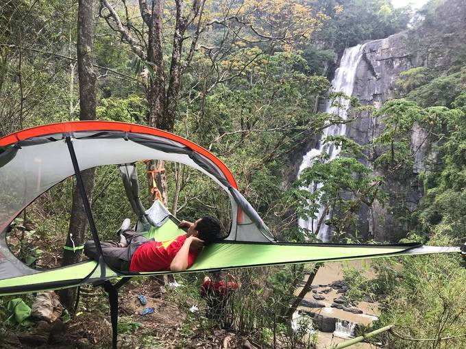 Muốn tận hưởng trọn vẹn và hòa mình giữa thiên nhiên thì bạn hãy thuê một chiếc lều võng. Đây là một kiểu cắm trại không nhất thiết phải cần một nơi bằng phẳng mà chỉ cần có nhiều cây lớn. Từ trong lều bạn thoải mái ngắm cảnh núi rừng từ trên cao, hóng gió, thư thái đọc sách hoặc trò chuyện với bạn bè... Ảnh: Ngô Anh Tuấn.