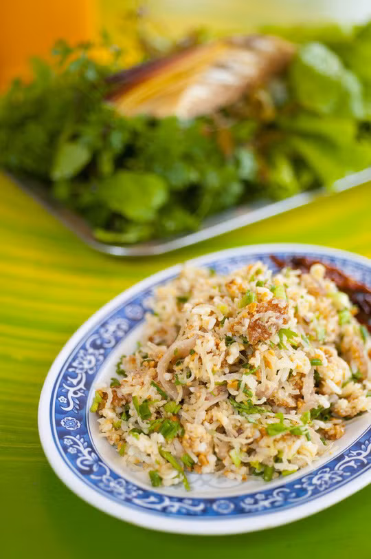 Người Lào không thích bỏ sót xôi. Vì vậy, họ đã tìm cách chế biến phần cơm dư thừa thành một món mới gọi là nam khao, bao gồm cơm nếp chiên và trộn với hành tây thái lát, đậu phộng, thảo mộc và những lát xúc xích thịt heo lên men gọi là som moo.