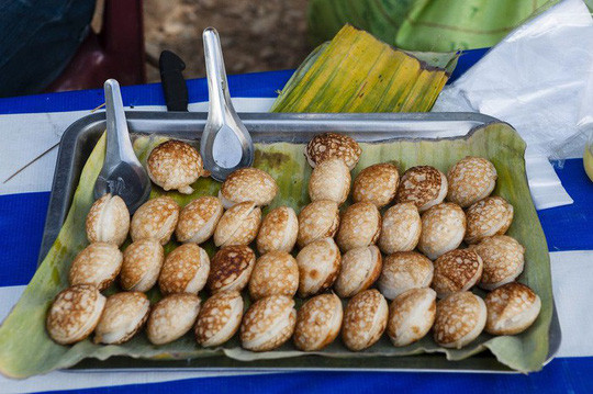 Khao Nom Krok được làm từ sữa dừa, đường, gạo nếp và bột mì, ăn kèm với thịt heo băm nhỏ, chấm nước mắm chua ngọt.
