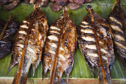 Đi đến bất cứ quầy hàng nào ở Vientiane, bạn cũng có thể dễ dàng bắt gặp món cá nướng với lá chanh và rau mùi. Thịt cá được nướng đến khi vàng đều, dậy mùi và ăn kèm với xôi.