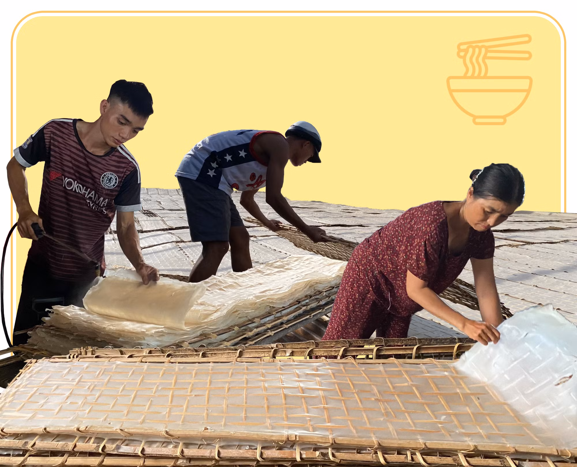 Còn ở phía dưới lò phở, anh Bảo đang tất bật thu gom từng mẻ bánh, cẩn thận kiểm tra độ ẩm, độ dẻo trước khi đưa vào máy cắt thành sợi. Xong công đoạn này, anh lại thoăn thoắt leo lên mái nhà thu gom các phên bánh còn lại. Gác chồng phên bánh lên kệ, anh Bảo nhẹ giọng: “Những ngày có nắng, tầm 16-17 giờ là làm xong việc. Còn những ngày mưa kéo dài, có hôm chúng tôi phải canh sấy bánh tới 12 giờ đêm”.