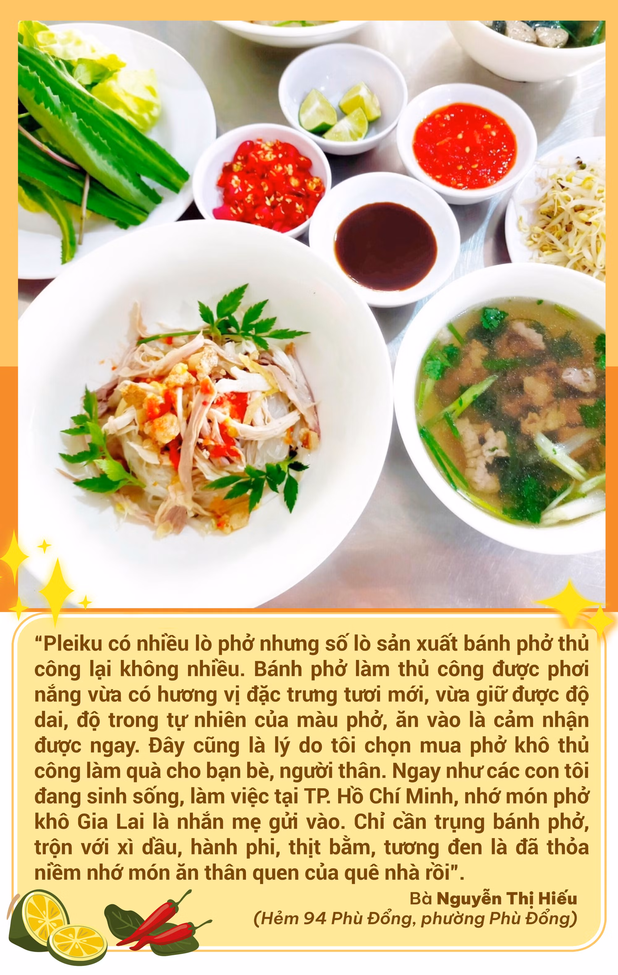 Đối với những người Pleiku ở xa, phở khô Gia Lai chính là một phần ký ức thân thương của quê hương, của tình thân gia đình. Bà Nguyễn Thị Phương Lan (18 Bà Triệu, phường Phù Đổng, TP. Pleiku) chia sẻ: “Các anh chị tôi đều sinh ra, lớn lên ở Pleiku. Mặc dù mấy chục năm sinh sống, lập nghiệp ở Tiền Giang, TP. Hồ Chí Minh, Đắk Nông nhưng mọi người vẫn không quên hương vị món phở khô Gia Lai. Mỗi khi nhớ nhà, nhớ món ăn này là anh chị nhắn tôi gửi bánh phở cho, dù trong đó không thiếu chỗ bán. Và, nhất định phải là phở khô được làm thủ công mang hương vị truyền thống chứ không phải loại nào khác”.