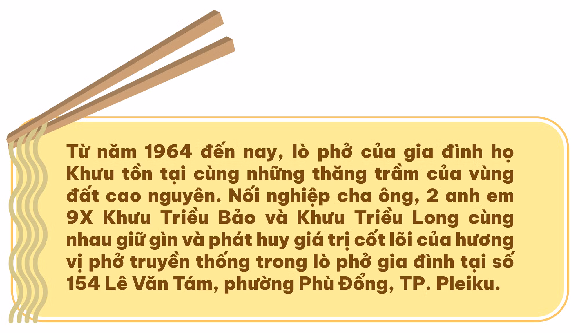 Anh Bảo, anh Long là thế hệ con cháu đời thứ tư đang tiếp nối nghề làm phở gia truyền. Nhớ lại nguồn gốc nghề phở gắn với sự xuất hiện lò phở trên vùng đất cao nguyên Pleiku, ông Khưu Phát Chương-cha của anh Bảo và anh Long-hồi tưởng: “Theo lời kể của mẹ tôi là bà Trần Thị Mùi, ông bà ngoại là người dân tộc Tày ở tỉnh Cao Bằng. Khi di cư vào Pleiku, ông bà tôi đã mở lò phở để mưu sinh. Lò phở được mở năm 1964, thuộc đường Bà Triệu ngày nay. Thuở đó, ông bà làm bánh phở Bắc, sợi mềm, cọng to, thái bằng tay.