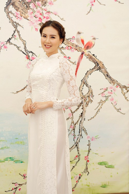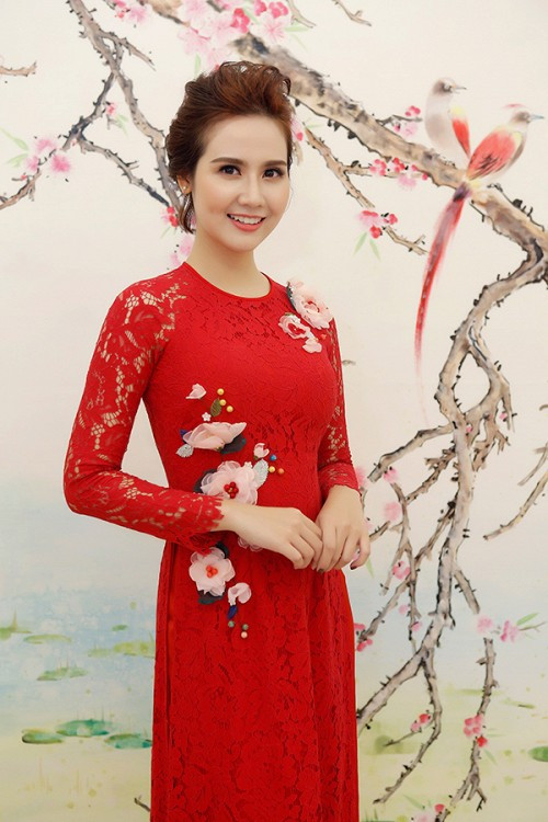 Nữ diễn viên Huyền Lizzie nổi bật với áo dài đỏ. Dù đã có một cậu con trai kháu khỉnh nhưng Huyền Lizzie vẫn trẻ trung, giữ vóc dáng thon gọn.