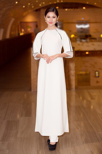 Thùy Dung diện thiết kế áo dài cách tân màu trắng tinh khôi của NTK Adrian Anh Tuấn.