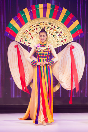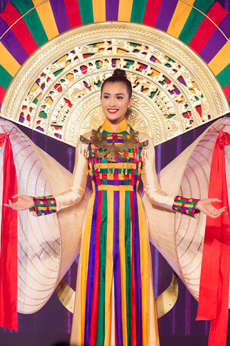 Phần cánh của bộ trang phục được phóng tác từ hình ảnh Trống Đồng như một niềm tự hào của dòng chảy lịch sử, sự chuyển tiếp, giao thoa giữa giá trị cổ xưa và nay.