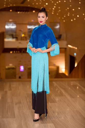 Lệ Hằng diện thiết kế áo dài gam màu xanh sáng, kết hợp cùng quần loe cách điệu của NTK Hà Linh Thư.