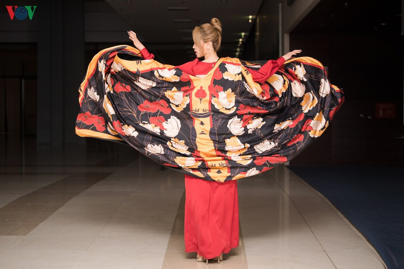 | Thiết kế áo dài kết hợp với áo choàng họa tiết hoa sen đầy màu sắc dường như làm cho nàng Á hậu nổi bật hơn. |