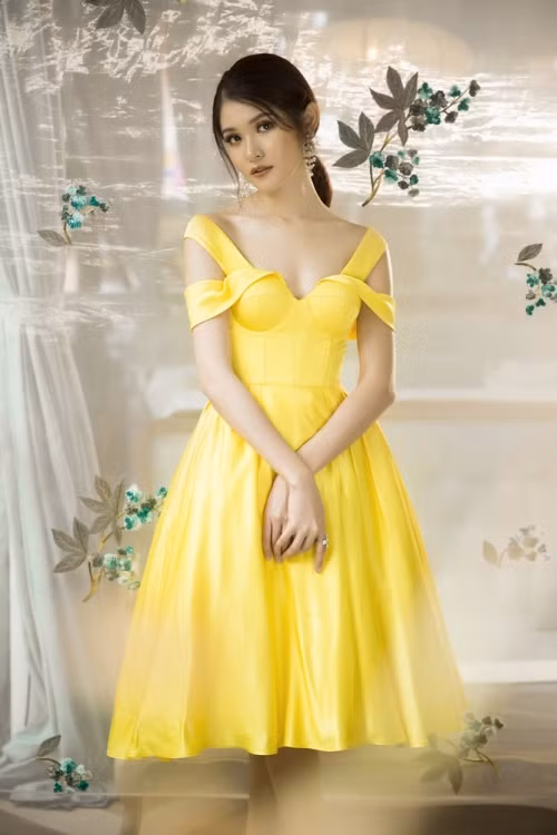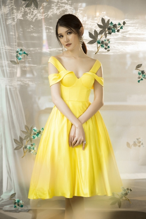 Ngọt ngào nhưng vẫn đầy kiêu kì là ấn tượng khi Thùy Dung diện chiếc đầm màu vàng tươi của NTK Lê Thanh Hòa. Với form dáng đầm xòe đơn giản trên chất liệu lụa cao cấp, người đẹp khoe khéo bờ vai thon.