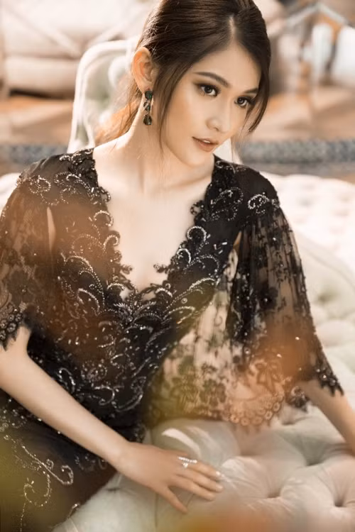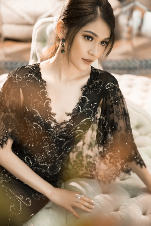 Vẫn là kiểu dáng ôm sát khoe dáng hình người mặc nhưng với phần cúp ngực được đính kết tạo điểm nhấn, Thùy Dung trở nên sang trọng và đầy bí ẩn.
