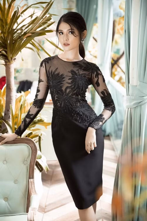 Thiết kế với form dáng bút chì ôm sát cơ thể cùng phần thân trên được phối lưới và trang trí họa tiết hoa ren giúp Thùy Dung nổi bật và quyến rũ.