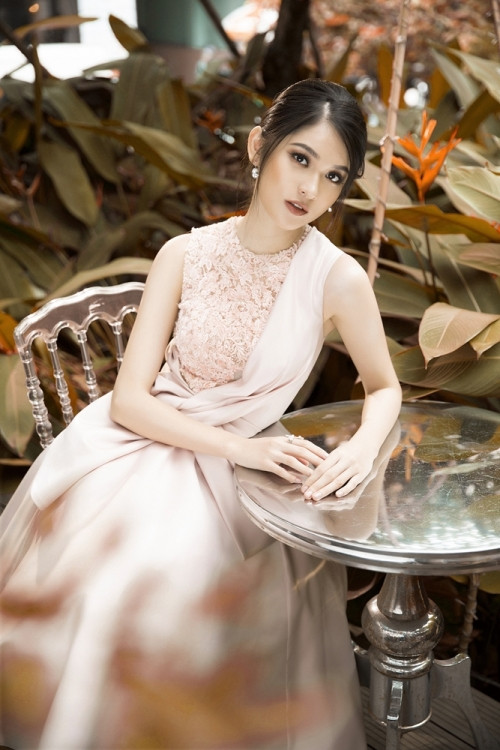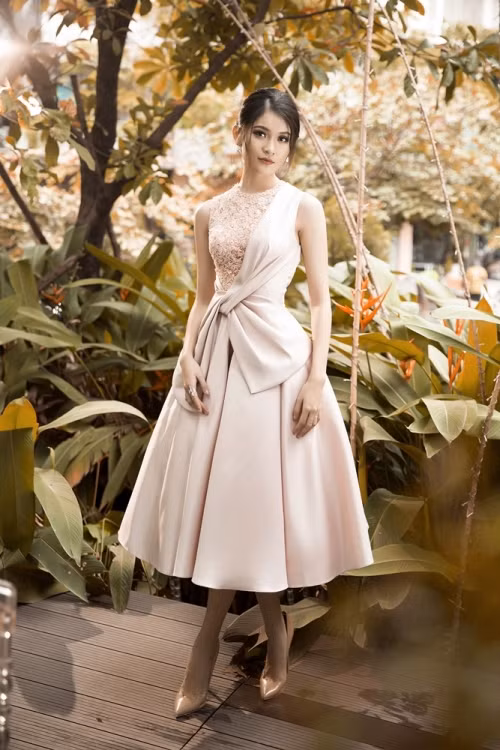 Sử dụng chất liệu taffa, nơ độc đáo và chi tiết ren đính đá để tạo điểm nhấn, Thùy Dung trông đầy ngọt ngào trong chiếc đầm màu hồng da.