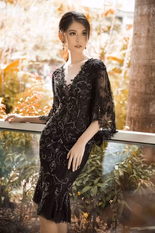 Quý phái và đầy tinh tế là hình ảnh của Thùy Dung khi diện chiếc đầm bút chì với họa tiết đính đá và tua rua cầu kì của NTK Lê Thanh Hòa.