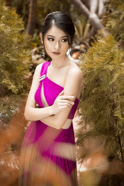 Chiếc váy màu hồng đậm và chất liệu chiffon xếp mềm mại làm nổi bật vẻ nữ tính, nhẹ nhàng của Thùy Dung, nhưng vạt cut out táo bạo lại tạo nên điểm nhấn cá tính cho á hậu.