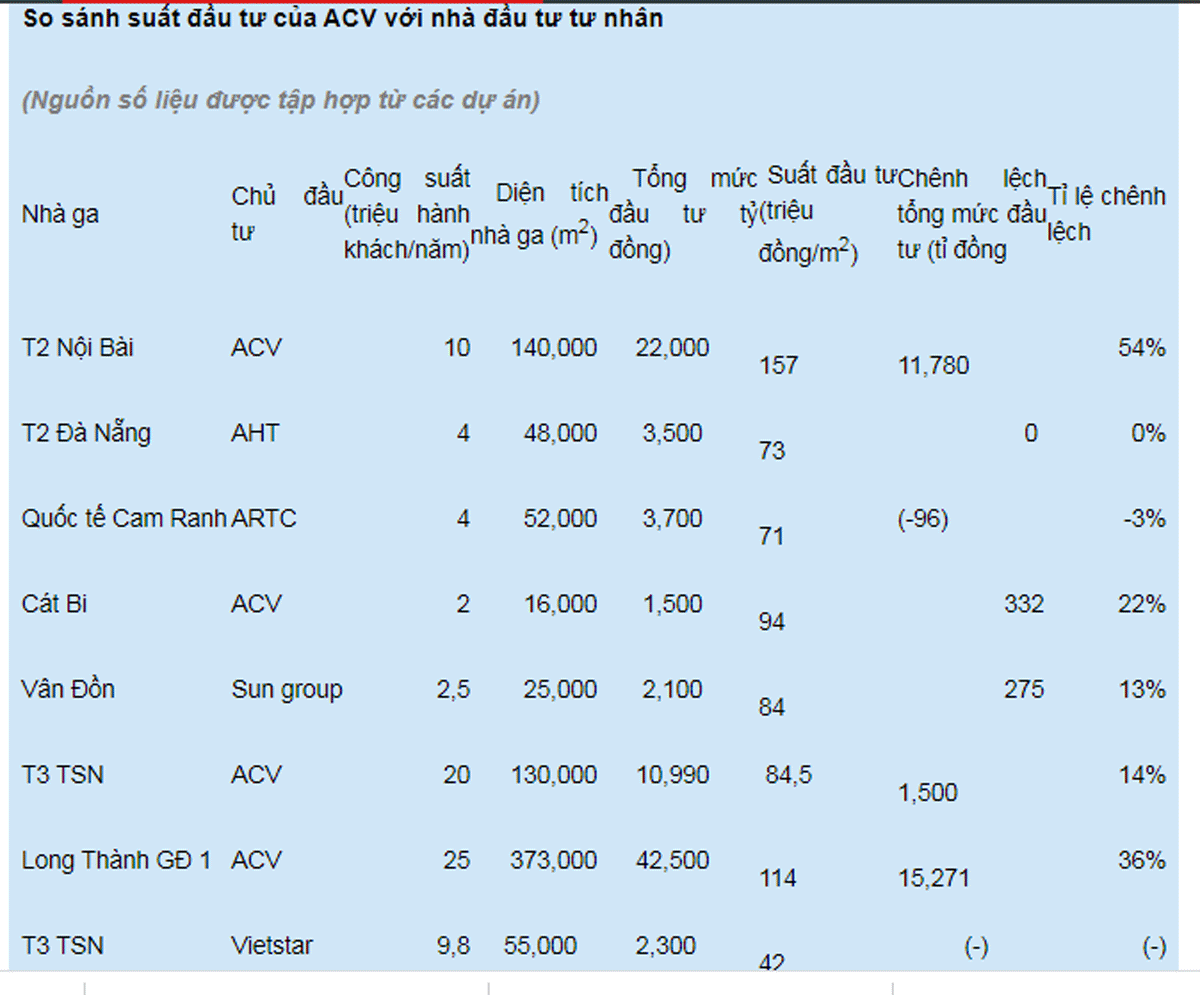 Bản so sánh suất đầu tư của ACV (Saigontimes)