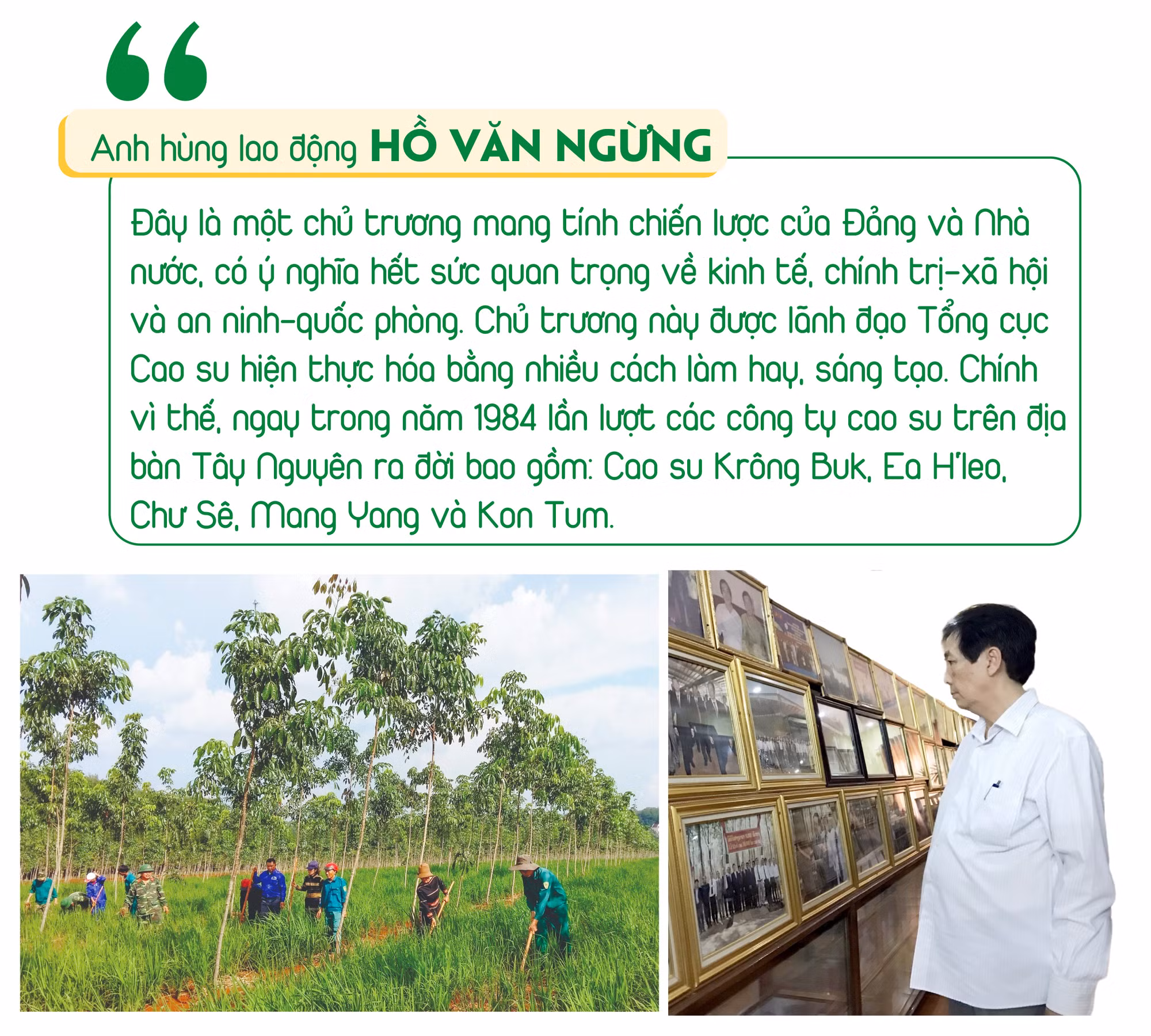Anh hùng lao động Hồ Văn Ngừng là một trong 18 người của Công ty Cao su Dầu Tiếng được giao nhiệm vụ giúp Công ty Cao su Chư Sê khảo sát, khai hoang đất, chuẩn bị giống để tiến hành trồng cao su. Nhớ lại những năm tháng khó khăn, gian khổ ấy, ông Hồ Văn Ngừng chia sẻ: “Khi chúng tôi lên Chư Sê thì đất còn hoang hóa, cây cối um tùm. Chúng tôi còn đối mặt với thú dữ, bom, mìn còn sót lại sau chiến tranh… Nhiều người dân và thậm chí là lãnh đạo địa phương vẫn không tin cây cao su có thể phát triển trên vùng đất đỏ này. Tuy nhiên, với sức trẻ, vừa làm vừa thử nghiệm, cuối cùng thì cây cao su đã trở nên xanh tốt và cho kết quả khả quan”.